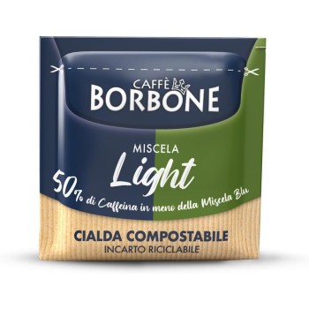 50% Miscela Blu, 50% Miscela Dek, 100% amiche della natura, le cialde Miscela Light sono compostabili e hanno un incarto completamente riciclabile nella carta.